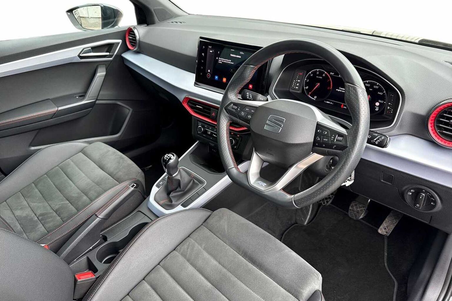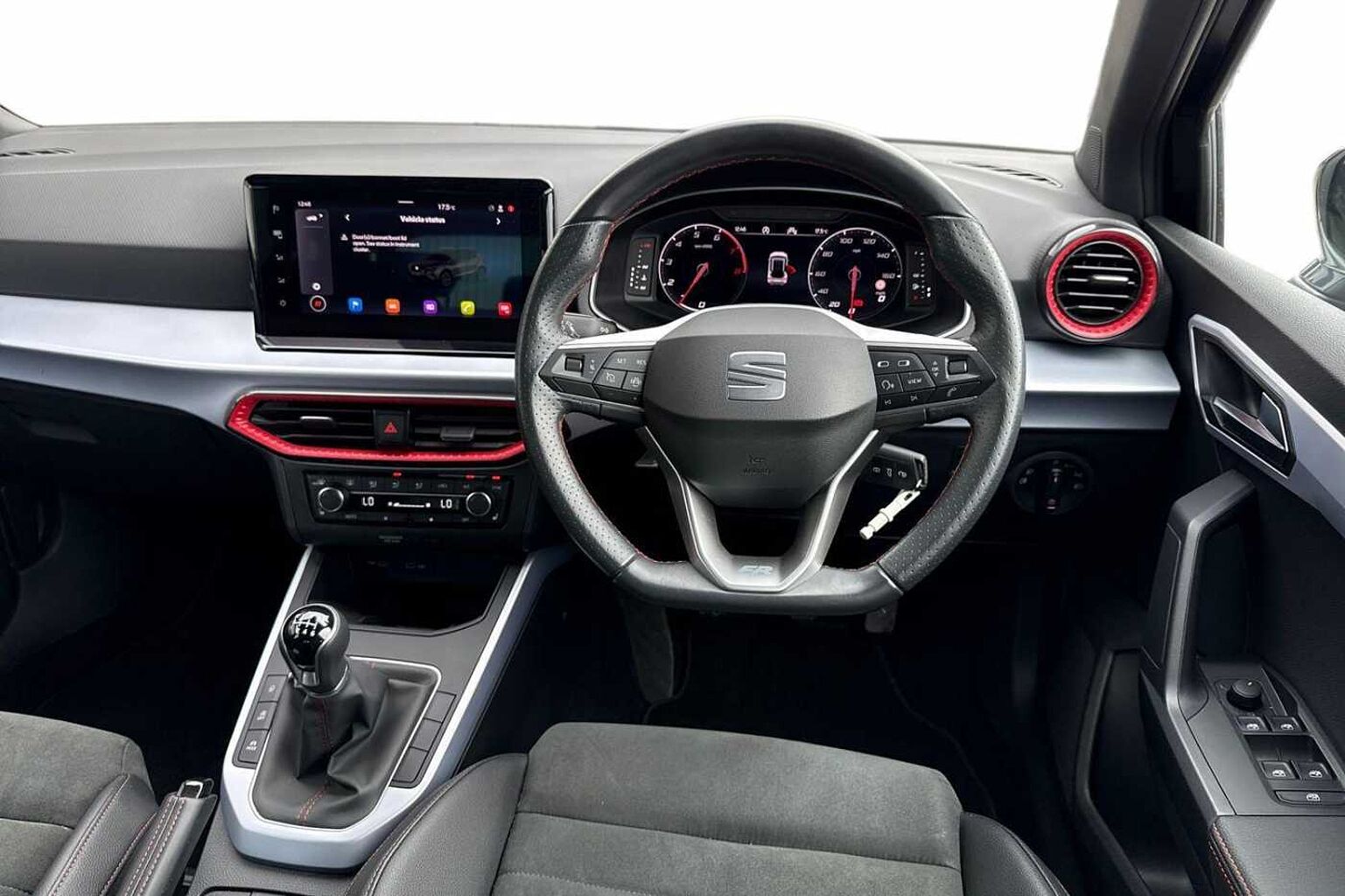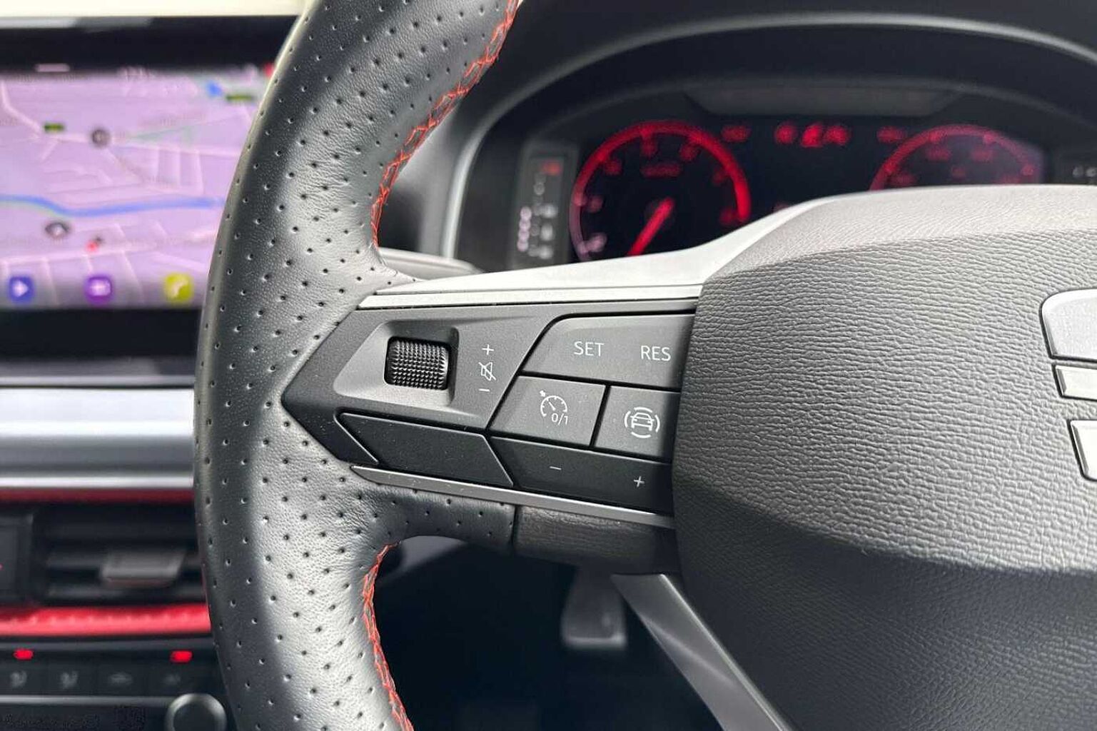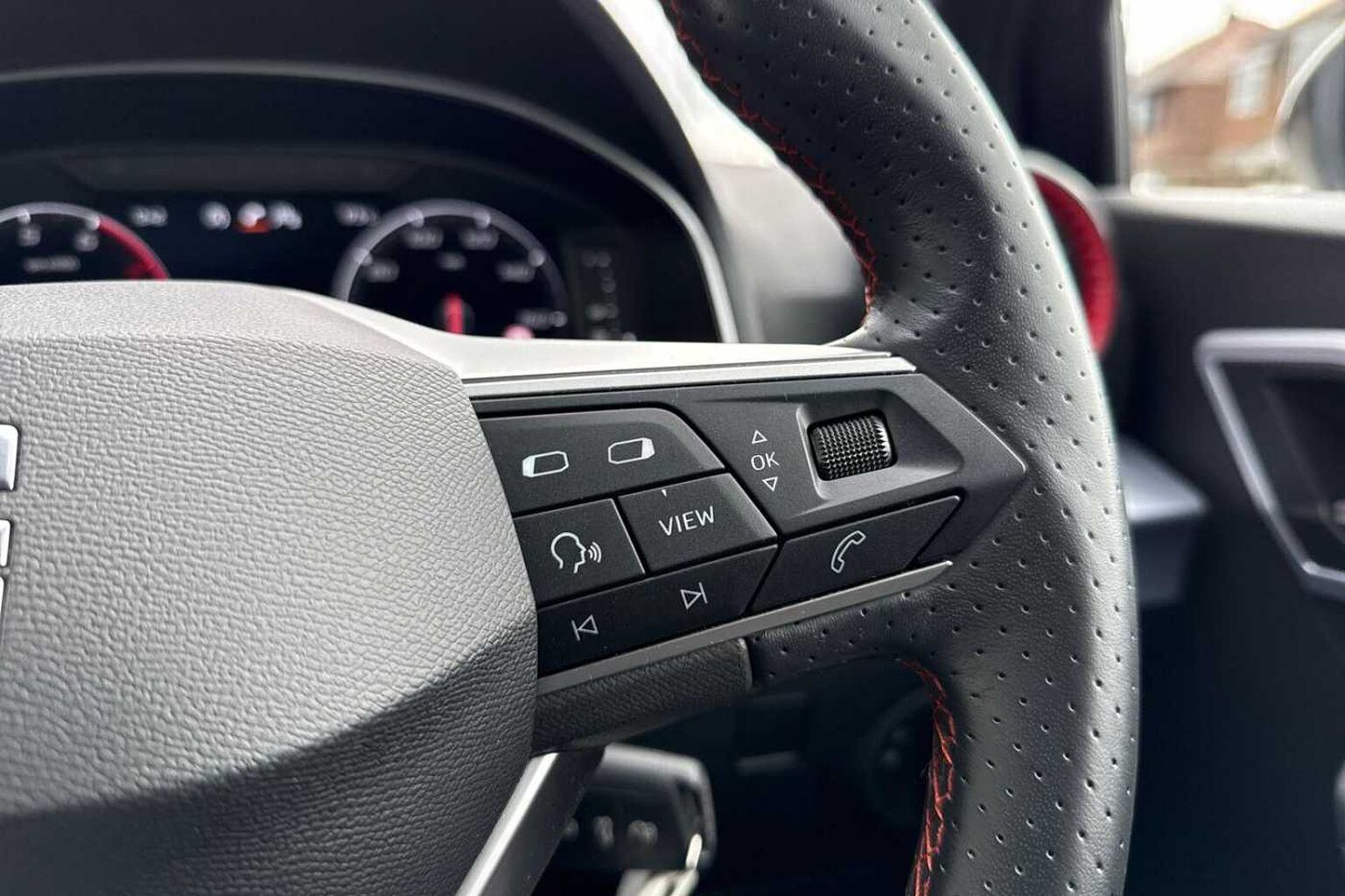 - Perforated flat bottomed leather steering wheel/gear knob/handbrake with red stitching and FR logo